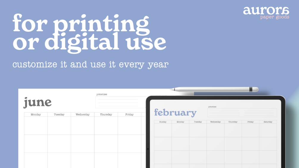 Stay organized and on track with this simple calendar. You can customize it and use it any year. Works as a printable or as a digital planner.